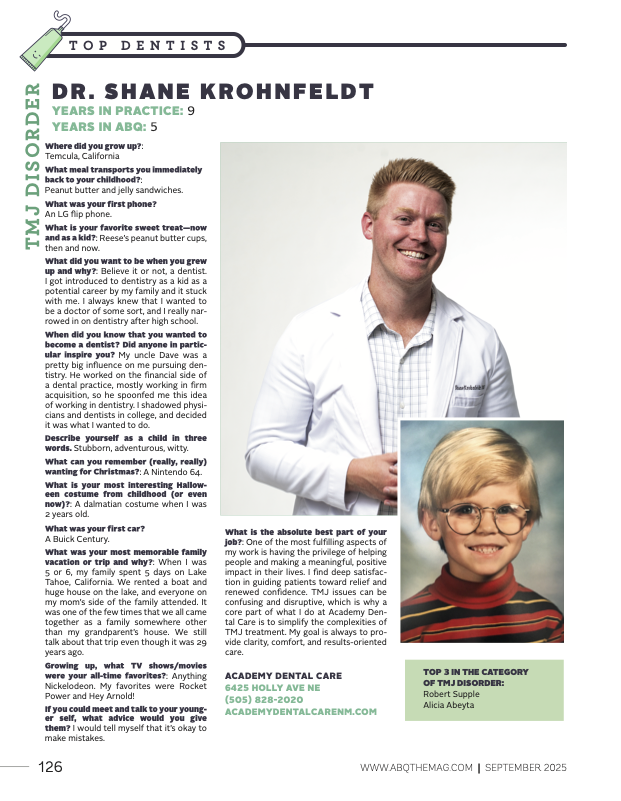 At Academy Dental Care, we are committed to redefining dental care by combining technical excellence, compassionate service, and patient-centered solutions. Under the leadership of Dr. Shane Krohnfeldt, recently recognized as one of Albuquerque’s top practitioners, our practice is proud to provide access to the best dentist in Albuquerque. Patients seeking high-quality dentistry and expert care consistently turn to Dr. Krohnfeldt for his award-winning approach.Dr. Shane Krohnfeldt: Recognized as the Best Dentist in AlbuquerqueDr. Krohnfeldt’s recognition in the TMJ disorder category places him among the top three dental professionals in Albuquerque, an honor determined by his peers. This distinction underscores his … Read More